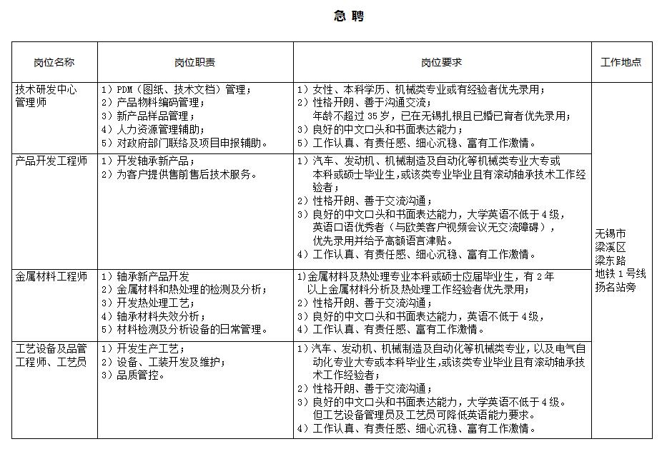 2)專業(yè)要求:摩擦學(xué)、滾動(dòng)軸承、金屬材料及先進(jìn)制造相關(guān)專業(yè);